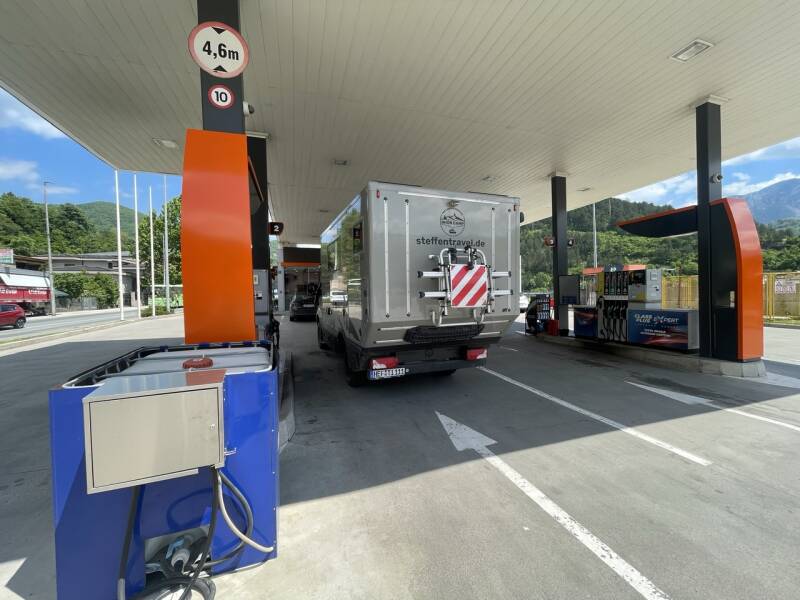Der Tank ist fast leer. Wie immer tanke ich an großen Markentankstellen. Der Liter Diesel kostet 1,17 €. An vielen Tankstelen gibt es auch AddBlue. An den Tankstellen muss man übrigens nicht selbst zapfen. Ich kaufe noch ein paar Lebensmittel, parke Tante Inge dieses mal aber nicht im Halteverbot. Beim Einkaufen stelle ich wieder fest, Kaum Fertiggerichte, wenig Obst und Gemüse. Das kaufe ich an Ständen an der Strasse.