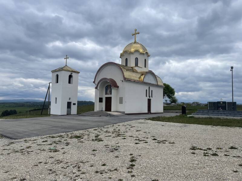 Dafür entdecke diese schöne, vermutlich Serbisch Orthodoxe Kirche abseits der Strasse. Fast alle Gotteshäuser hier in der Region wurde im Krieg zerstört. Moscheen, Kirchen und Synagogen. Bei dieser Kirche liegen auch noch Steine wahrscheinlich von der alten Kirche.