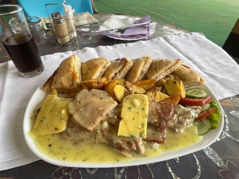 Was es war? Keine Ahnung. Das Fleisch war geräuchert, die Soße lecker. Hat aber den Rest des Tages schwer im Magen gelegen. Gesund war es bestimmt.