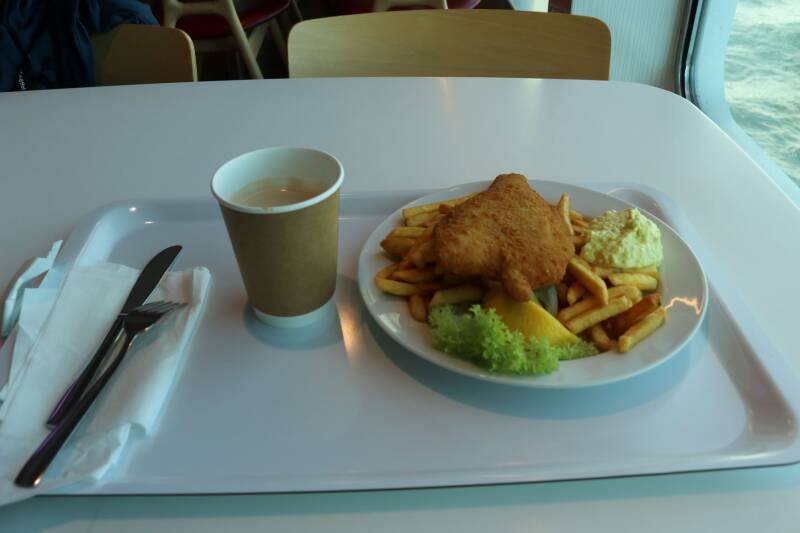 Auf der Fähre gönne ich mir zum Mittag auf meiner Reise den ersten Fisch mit frittieren Gemüse, lecker.