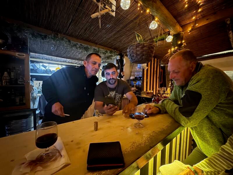 Es gibt auch eine Bar, hier mit meinen Reisebekannten.......am Abend. Der Rotwein ist lecker und günstig.